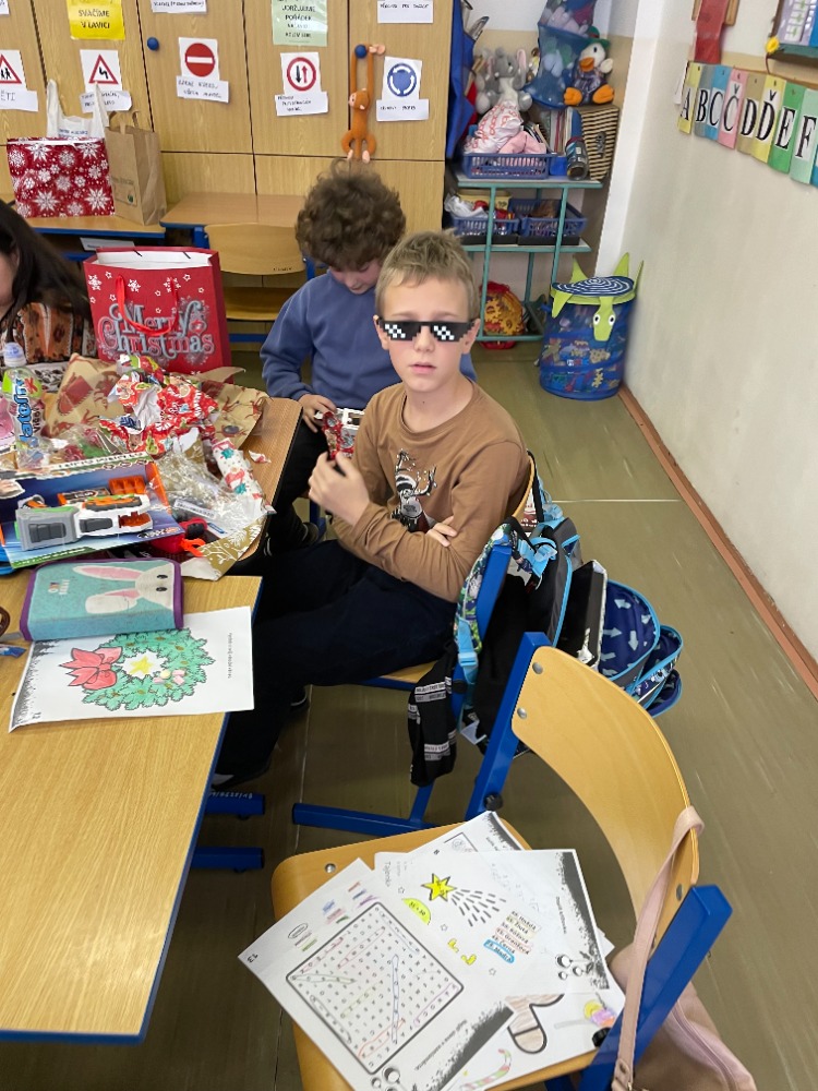 Tak zase po roce jsou tu očekávané Vánoce. Poslední školní den v tomto roce se proměnil v nádhernou třídní besídku, kde jsme si všichni pod stromeček nachystali překvapení. Z domova jsme si přinesli cukrovíčko a ve škole si uvařili vánoční čaj. Nic nám nechybělo, proto besídka mohla začít. Vybarvovali jsme různé vánoční symboly a motivy, hráli hry a nemohli jsme se dočkat až si mezi sebou rozdáme dárečky. Mezitím nám do třídy přišel pan učitel Kranda zahrát vánoční koledy. Potom už nastal čas, kdy se dárky mohly rozbalit. To bylo radosti! Každý dáreček byl věnován od srdíčka a promyšleně, což jsme všichni ocenili. Ani se nám nechtělo z besídky odejít domů.
